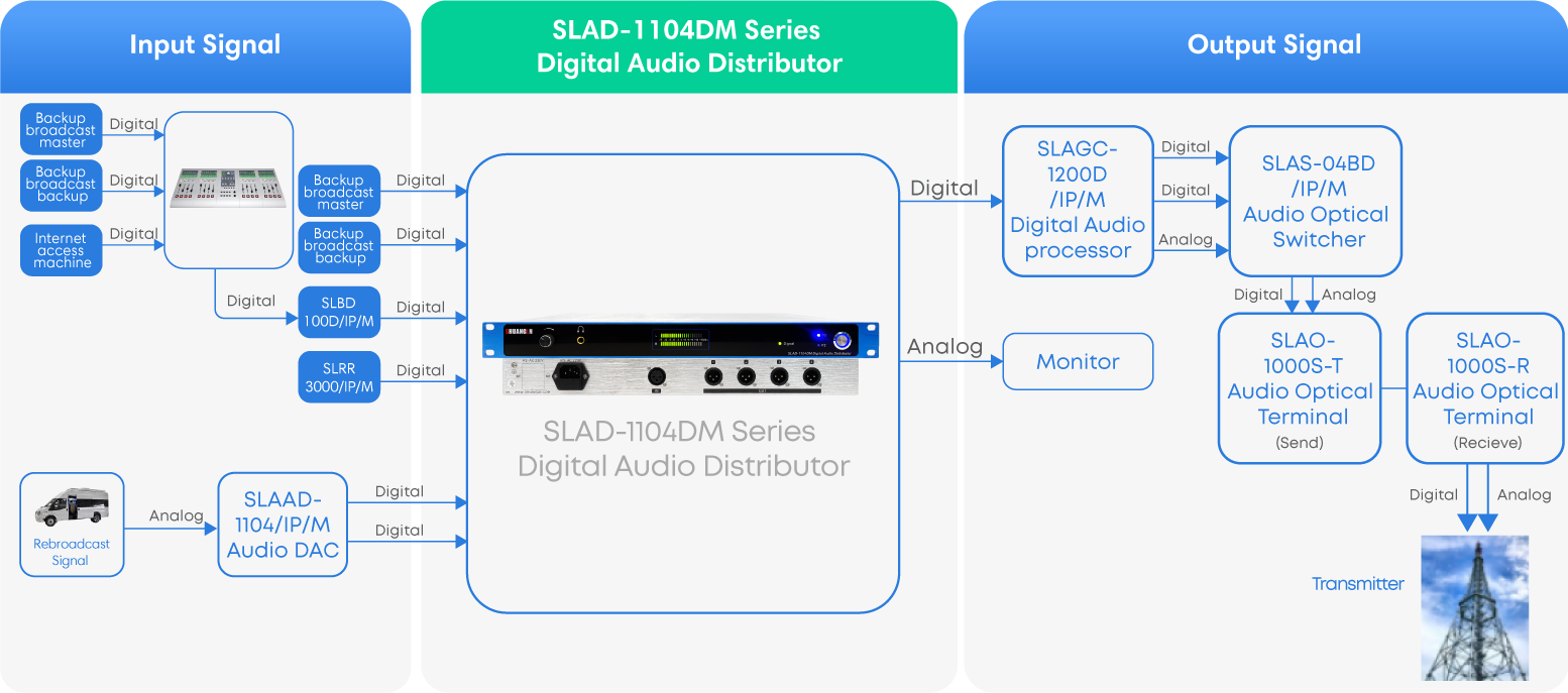 The SLAD-1104DM (Digital Audio Distributor) series digital audio distributor is developed by Hunan Shuangln Electronic Technology Co., Ltd. using advanced dedicated digital audio chips from around the world, ensuring high performance, stable quality, and reliability. The technical specifications of this product meet national Class A broadcasting standards and are widely used in live broadcasts, recordings, and rebroadcasts for radio and television stations, as well as in other media centers, studios, enterprises, schools, sports venues, stations, airports, hospitals, conference halls, hotels, and other places that require extensive digital audio signal distribution and output.