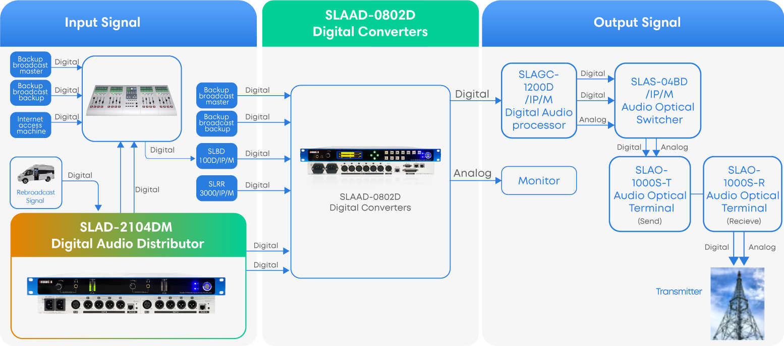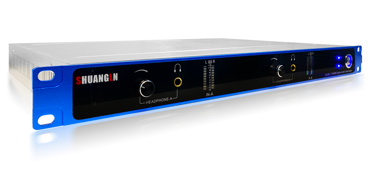 SLAD-2104DM (Digital Audio Distributor) digital audio distributor is developed by Hunan Shuangln Electronics Technology Co., Ltd. using advanced dedicated digital audio chips from around the world, ensuring high specifications, superior performance, and stable reliability. The technical specifications of this product meet national Class A broadcasting standards and are widely used in various scenarios requiring digital audio signal distribution and output, such as media convergence centers, TV stations, broadcasting studios, radio stations, enterprises, schools, sports venues, stations, airports, hospitals, conference halls, hotels, and more.