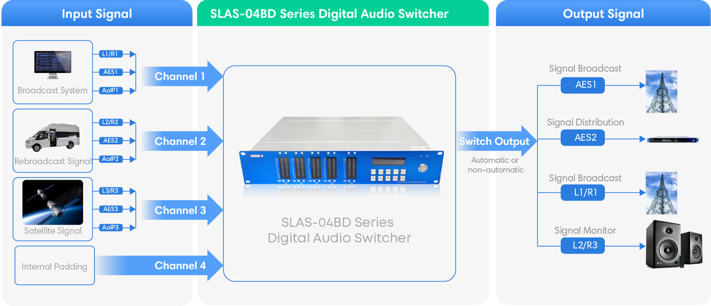 The SLAS-04BD series digital audio switcher is specifically developed and designed by Hunan Shuangln Electronics Technology Co., Ltd. to meet the needs of radio station production and safe broadcasting. It is a broadcast-grade digital audio switching device with intelligent switching and recovery capabilities, widely used in production departments, broadcasting systems, control systems, and transmission systems at various levels of radio stations. The product features three digital, analog audio inputs or AOIP network audio inputs, one built-in backup sound (changeable via SD card), achieving intelligent 4-to-1 switching; it outputs 1+2 digital audio and analog L/R stereo signals, as well as sends three digital and analog audio input signals and the switched audio output to the AOIP network for real-time broadcasting or monitoring. Additionally, based on SNMP protocol, it can achieve remote cloud maintenance and dynamic parameter monitoring, enabling fully automated broadcasting without manual supervision. This product has been tested by the National Radio and Television Administrations Radio and Television Metrology Center, meeting all Class A technical requirements for broadcasting and receiving the National Radio and Television Administrations Certification for Radio and Television Equipment and Materials.