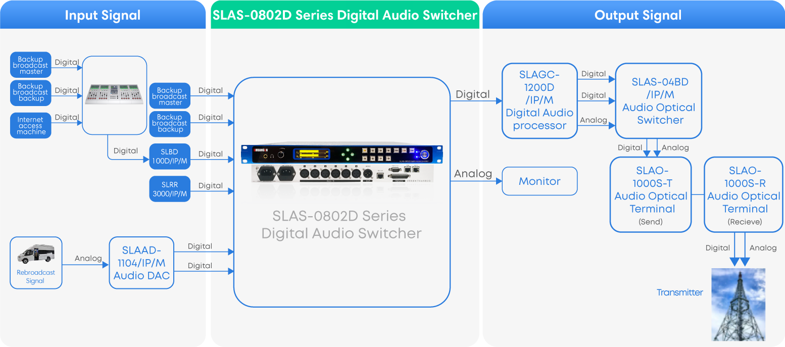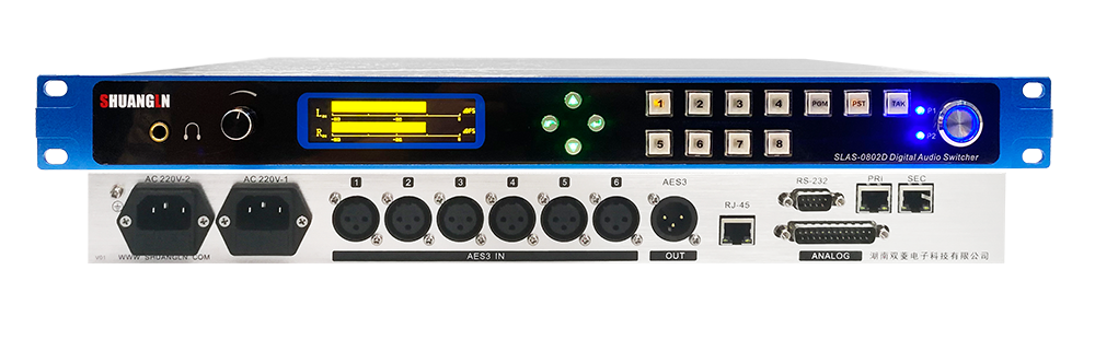 The SLAS-0802D series digital audio switcher is a smart broadcast-grade audio switching device specifically developed by Hunan Shuangln Electronics Technology Co., Ltd. for the needs of broadcasting production and secure broadcasting. It is widely used in production departments and broadcasting systems of radio stations at all levels. The product features 6 AES/EBU digital inputs, 2 analog L/R stereo inputs, 1 AES/EBU digital audio broadcast, and 1 analog L/R stereo pre-listen output. It also has the capability to send local 8-channel inputs and 2 broadcast/pre-listen signals in real-time over AoIP for network monitoring. The switcher can be manually controlled remotely via a control panel or automatically controlled by audio workstation software. Additionally, it supports remote cloud maintenance parameter monitoring based on SNMP protocol, meeting various security broadcasting and maintenance requirements, achieving fully automated broadcasting without manual supervision.