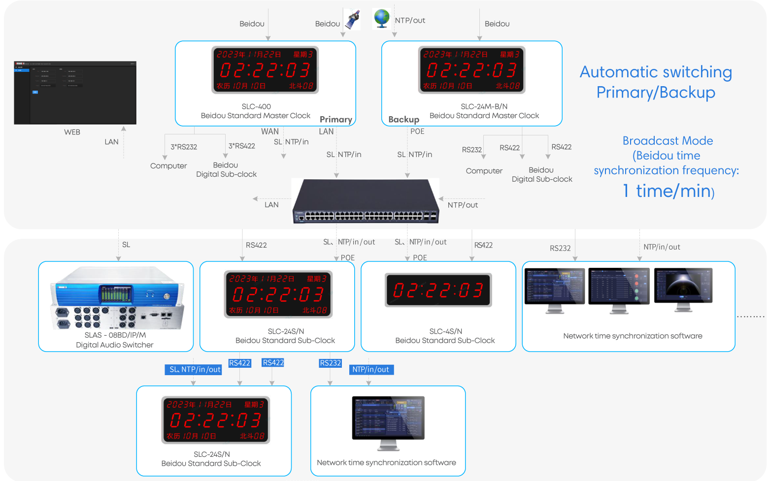 Hunan Shuangln independently developed and produced Beidou standard clock system receives the standard world time transmitted by the Beidou Navigation Satellite System, decoding it into the standard Beijing Time. The Hunan Shuangln Beidou Standard Clock System is highly resistant to external interference, ensuring high accuracy in the time it obtains. The system can automatically lock onto standard time and perform automatic time synchronization. When there is no Beidou signal or the signal is poor, the system will automatically maintain time, or you can manually adjust the time. The clock system provides standard time for central server rooms, computer networks, playout automation system systems, station logo systems, subtitle machines, and other equipment through time synchronization, maintenance, and timing.