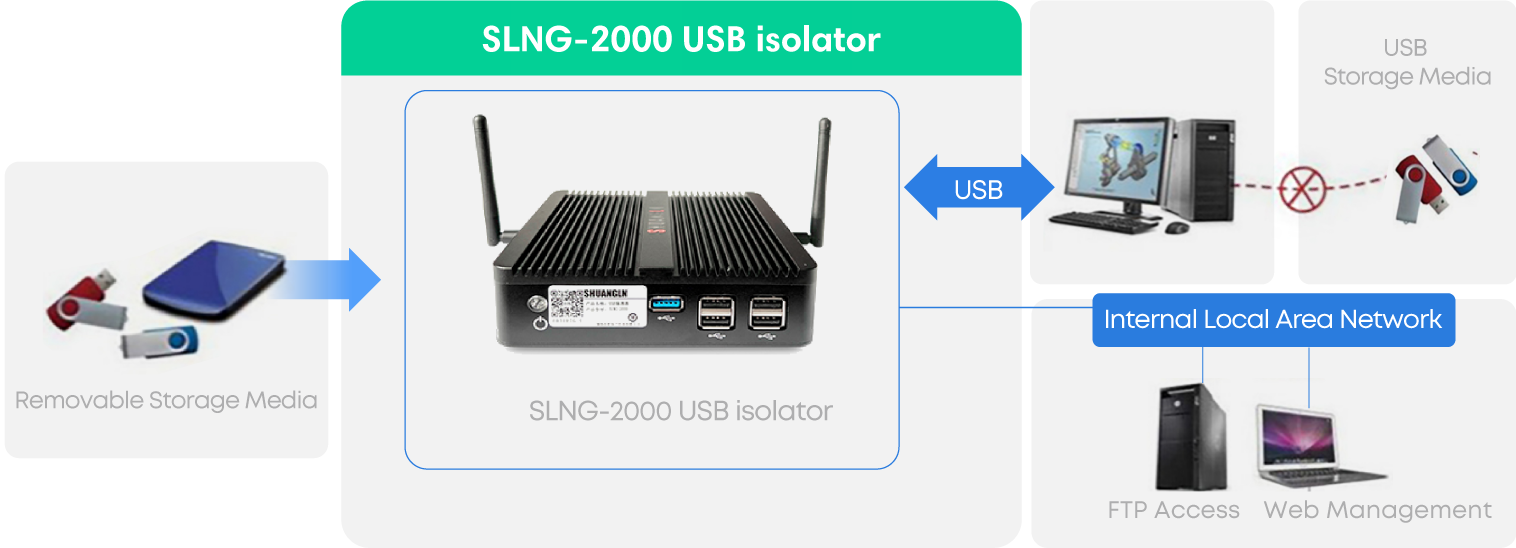 Hunan Shuangln USB Media Security Guard (SLNG-2000) is a USB virus isolation device based on the Linux system. It can detect and isolate viruses by controlling the data transmission of USB mobile storage media, which can effectively prevent the threat brought by viruses carried by files on USB mobile storage to PC in the Intranet.